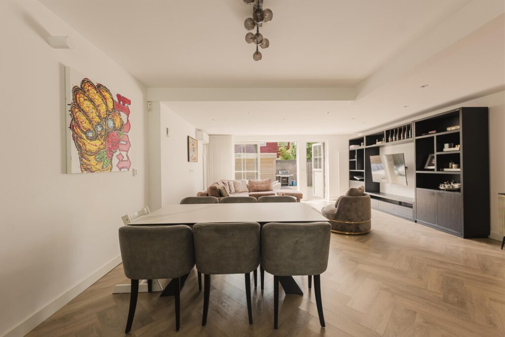 Entree met toilet en trapopgang. Aan de voorzijde ligt de keuken met aansluitend een eetkamer. De royale en lichte uitgebouwde woonkamer grenst aan de tuin en is voorzien van grote raampartijen die voor veel daglicht zorgen.