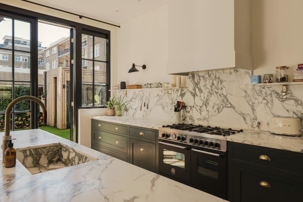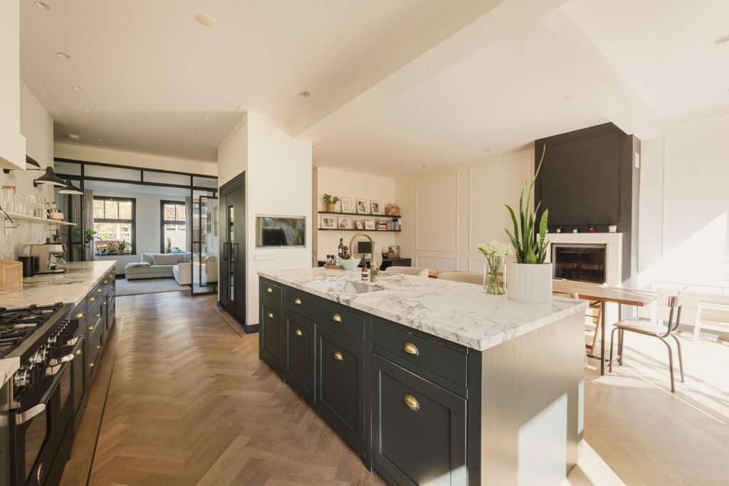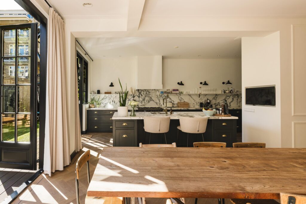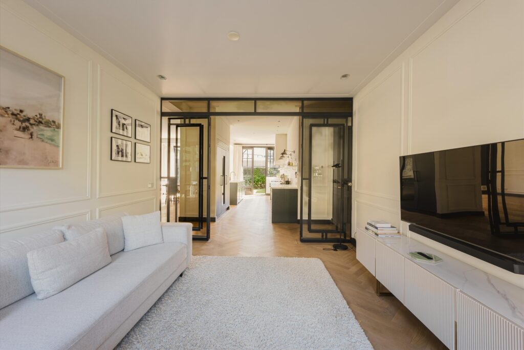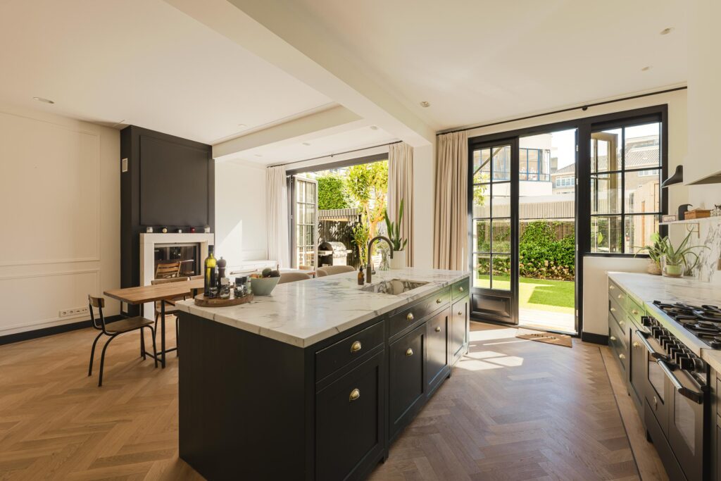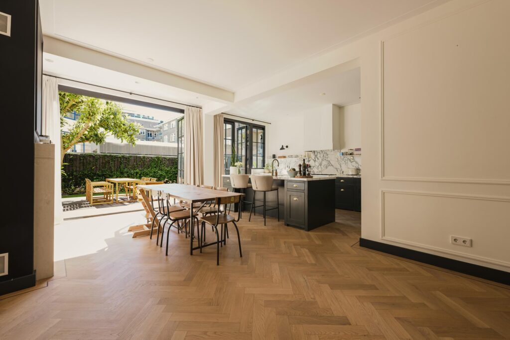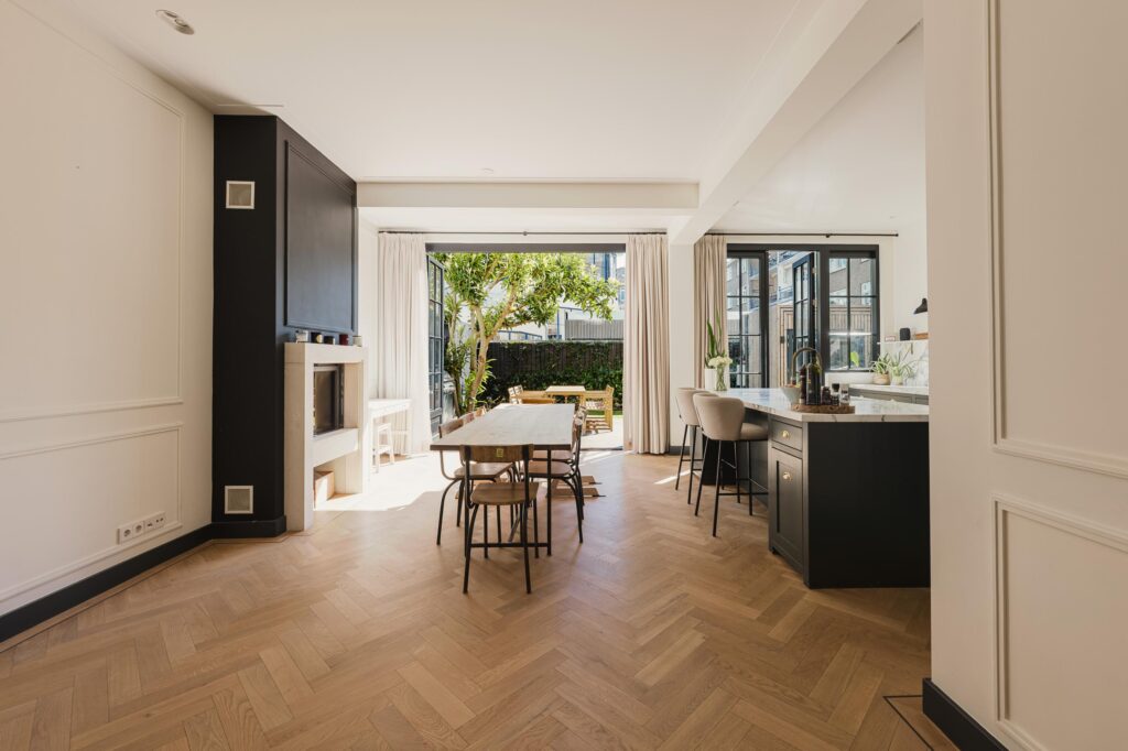 De gezellige woonkamer ligt aan de voorkant. De ruimte tussen de woonkamer en de aansluitende leefkeuken kunt u afsluiten door de twee stalen deuren. De keuken is het hart van het huis en bevindt zich in het midden van de ruimte. De DBD (Designed by David) keuken is volledig op maat gemaakt en is van alle gemakken voorzien zoals grote ijskast/vriezer, wijn klimaatkast, Quooker, vaatwasser, fornuis met dubbele oven en een ingebouwde afzuigkap. Aan de achterzijde, aangrenzend aan de keuken bevindt zich de eetkamer met openhaard die eveneens functioneert als kachel. Door de sfeervolle harmonica pui, kunnen de deuren volledig open en wordt de tuin die op het zuiden ligt perfect verbonden met het huis.