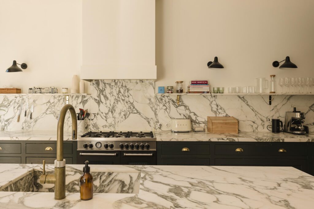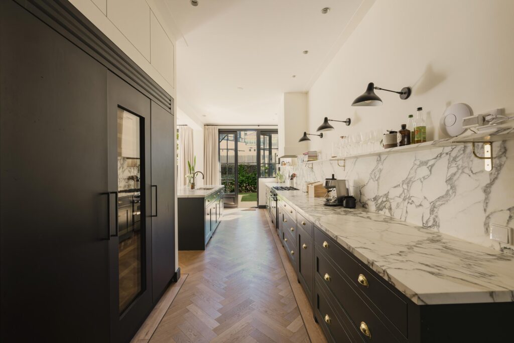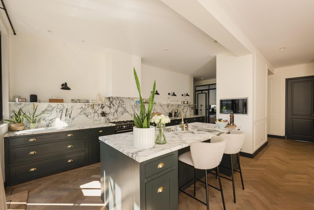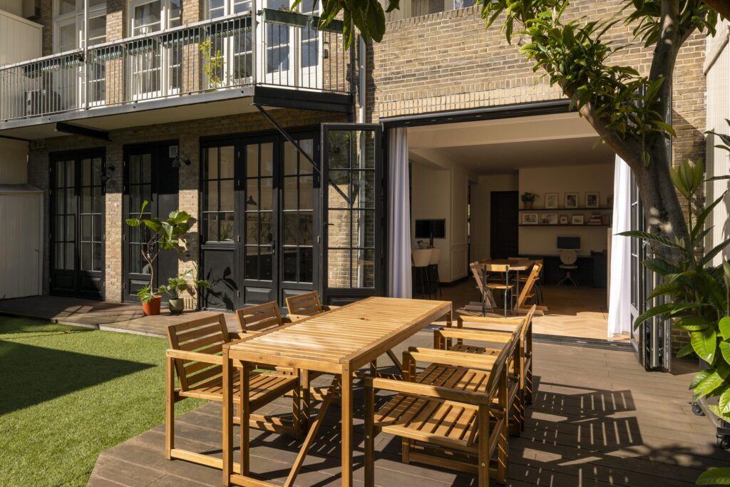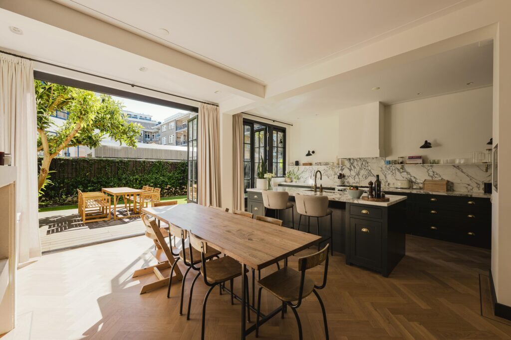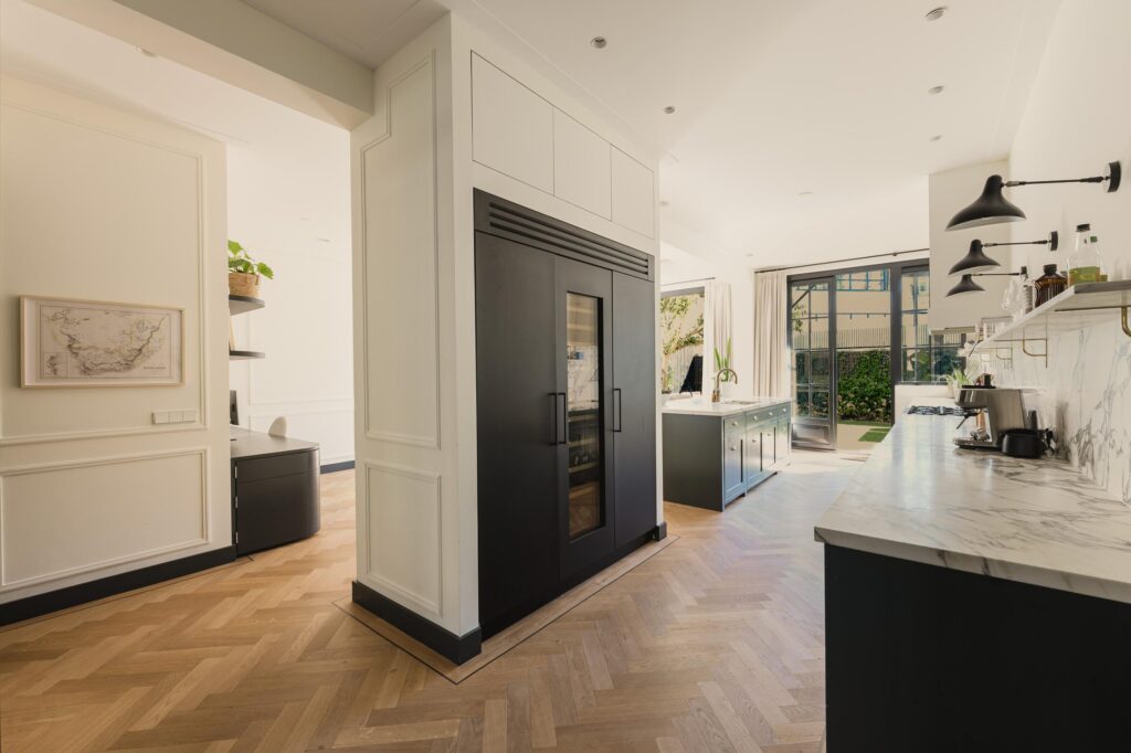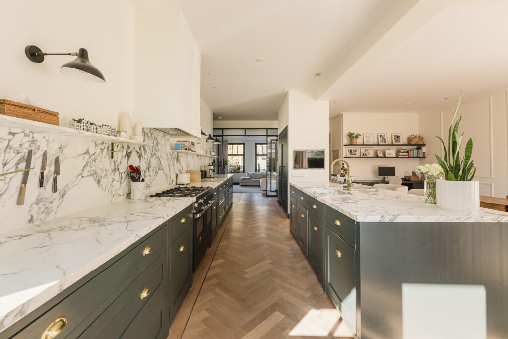 De gezellige woonkamer ligt aan de voorkant. De ruimte tussen de woonkamer en de aansluitende leefkeuken kunt u afsluiten door de twee stalen deuren. De keuken is het hart van het huis en bevindt zich in het midden van de ruimte. De DBD (Designed by David) keuken is volledig op maat gemaakt en is van alle gemakken voorzien zoals grote ijskast/vriezer, wijn klimaatkast, Quooker, vaatwasser, fornuis met dubbele oven en een ingebouwde afzuigkap. Aan de achterzijde, aangrenzend aan de keuken bevindt zich de eetkamer met openhaard die eveneens functioneert als kachel. Door de sfeervolle harmonica pui, kunnen de deuren volledig open en wordt de tuin die op het zuiden ligt perfect verbonden met het huis.