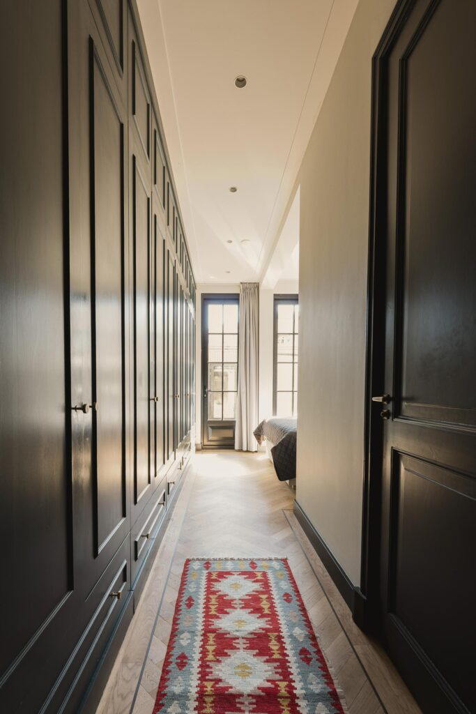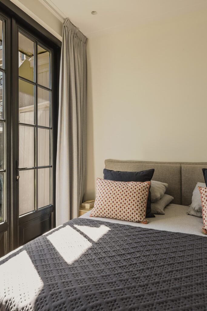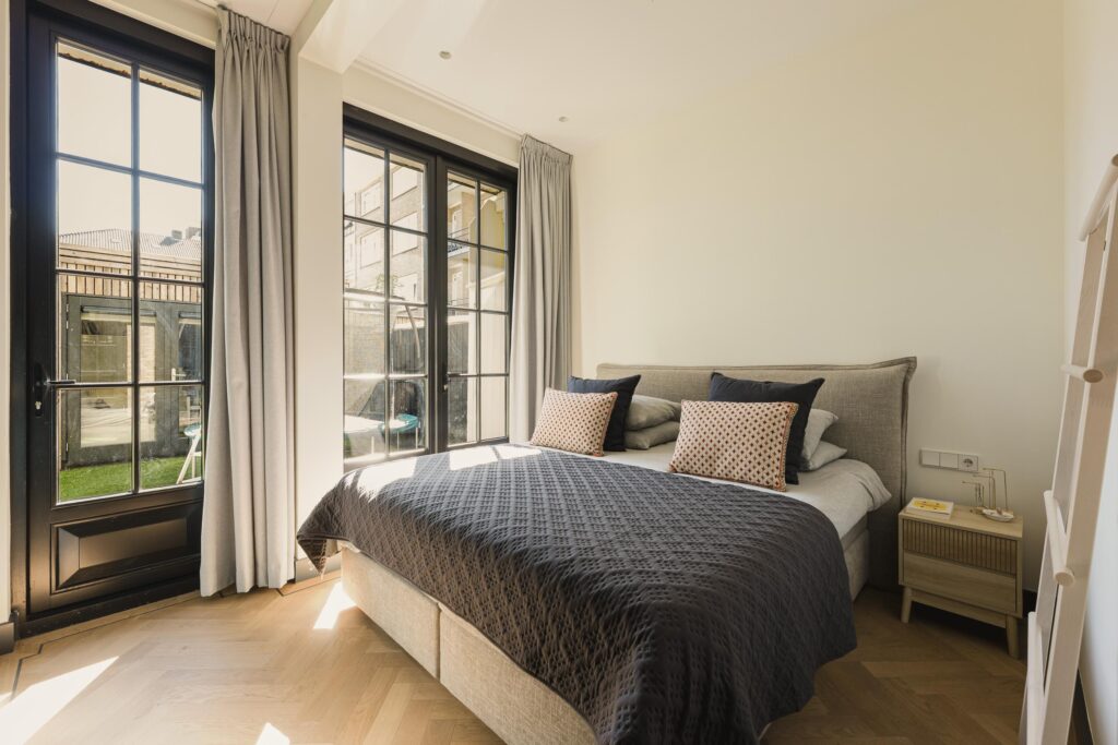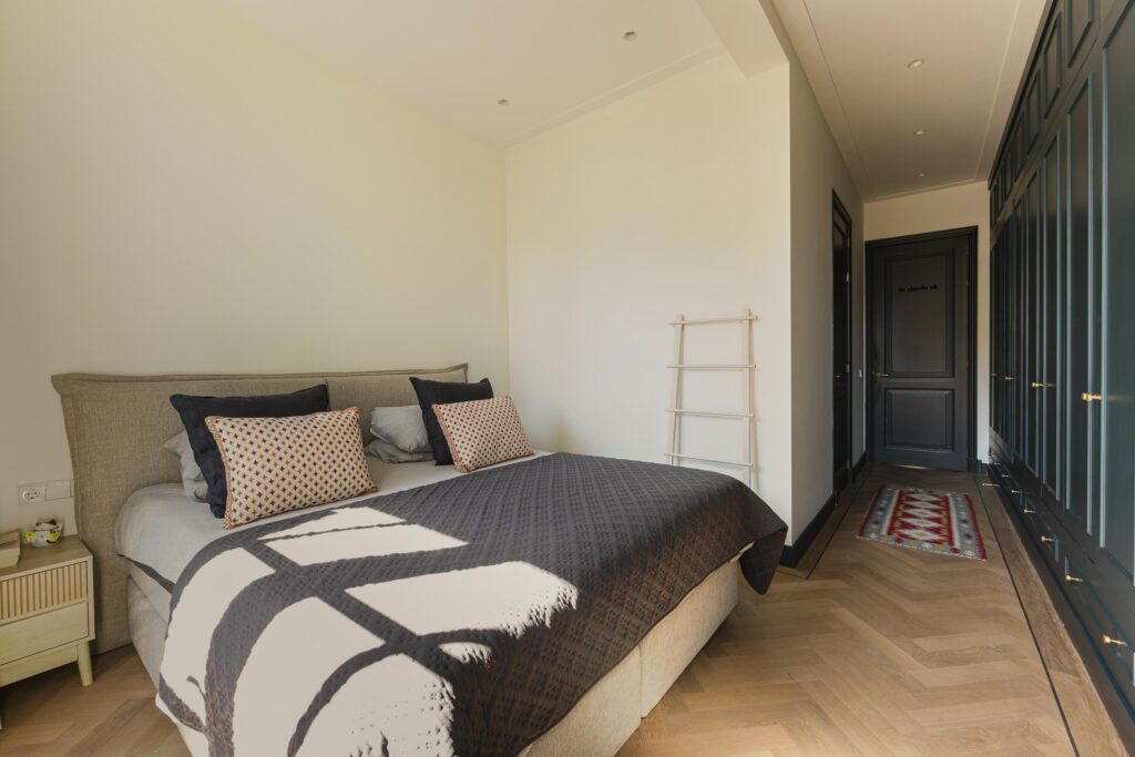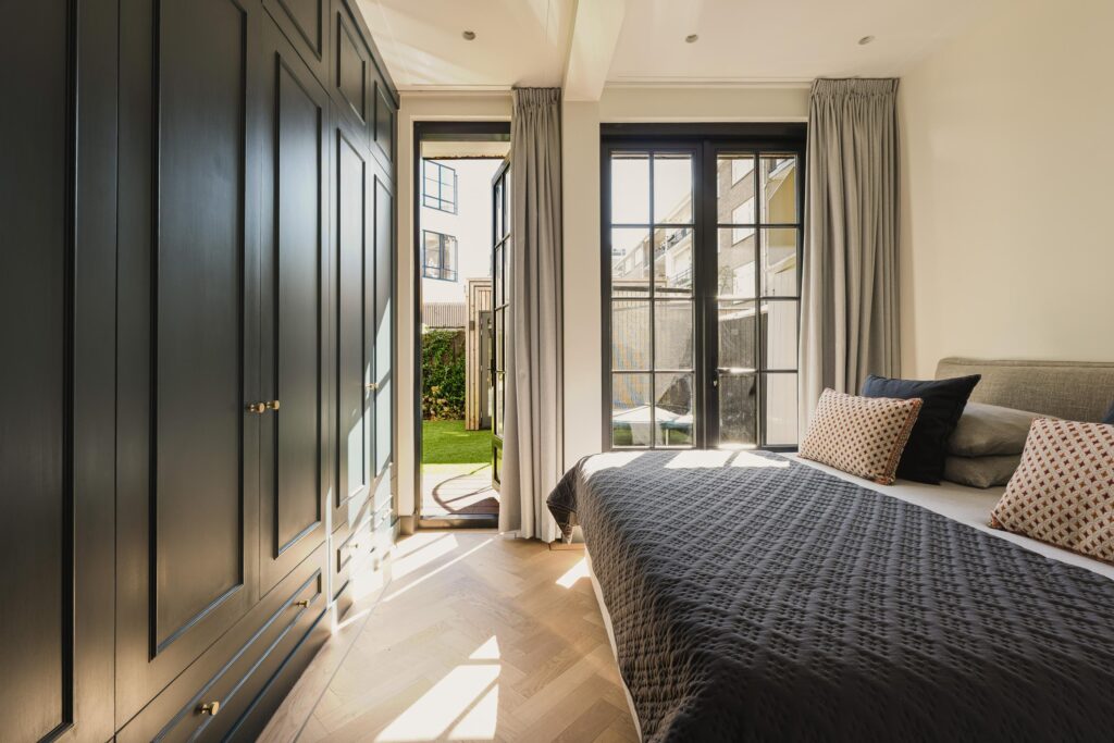 Aan de rechter achterzijde bevindt zich de primaire slaapkamer met en-suite badkamer. De volledige muur (6 meter) is voorzien van ruime inbouwkasten door DBD (Designed by David). De badkamer is voorzien van een ligbad, douche, wc en dubbele wastafel met meubel. Deze slaapkamer heeft openslaande deuren naar de tuin.