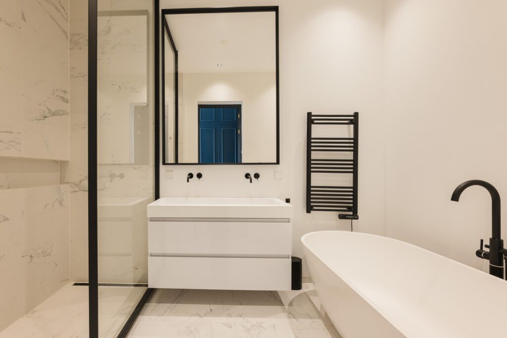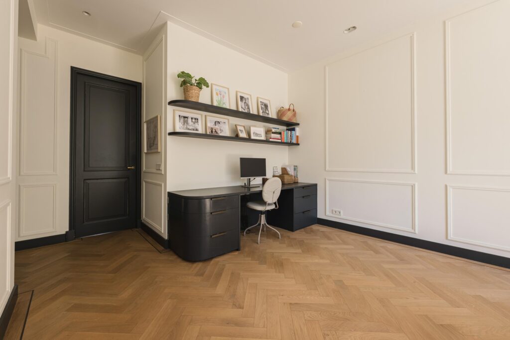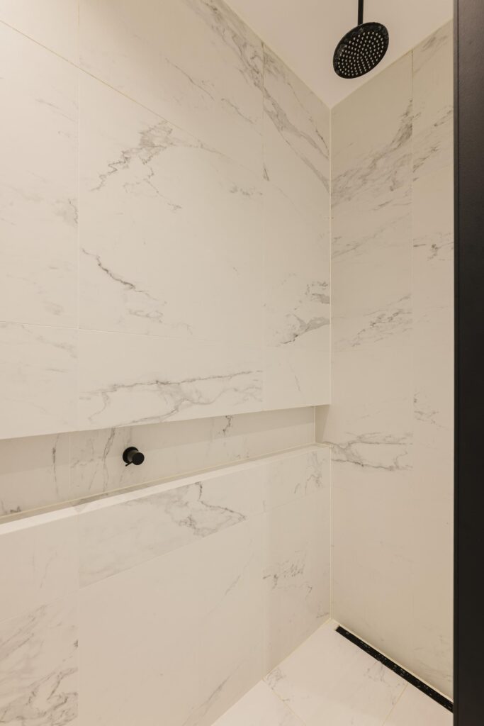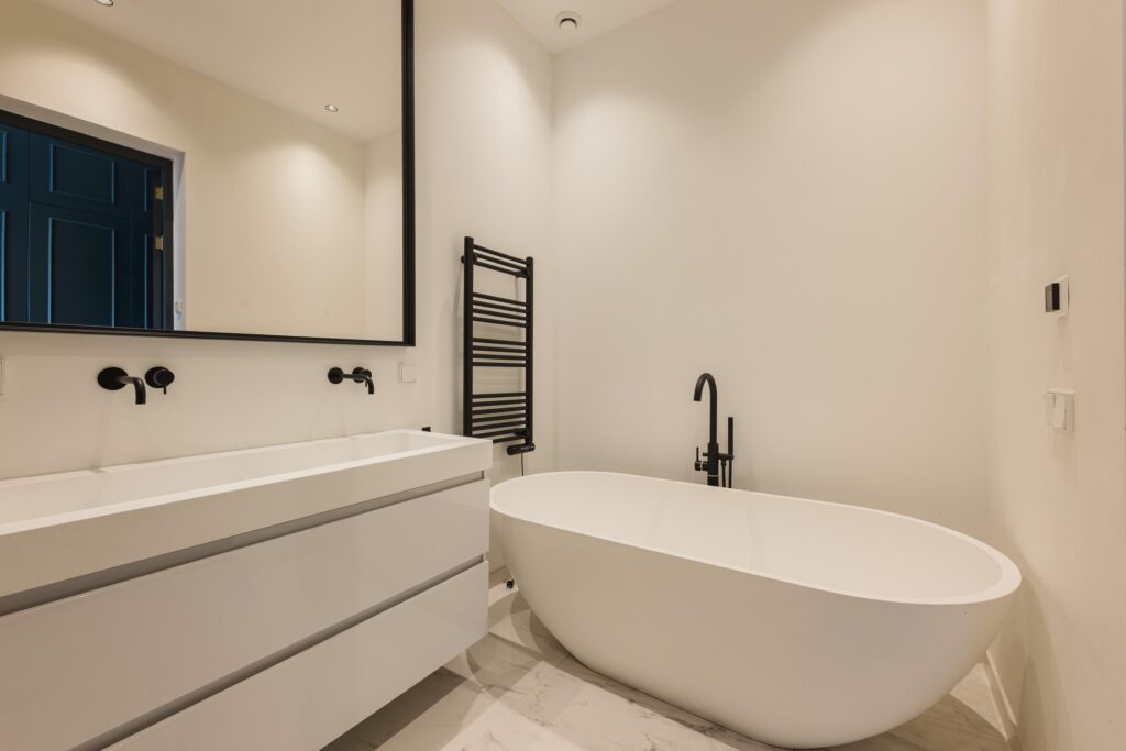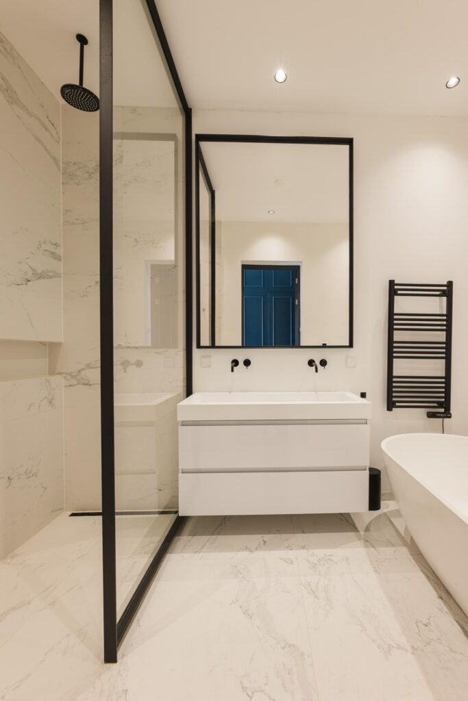 Aan de rechter achterzijde bevindt zich de primaire slaapkamer met en-suite badkamer. De volledige muur (6 meter) is voorzien van ruime inbouwkasten door DBD (Designed by David). De badkamer is voorzien van een ligbad, douche, wc en dubbele wastafel met meubel. Deze slaapkamer heeft openslaande deuren naar de tuin.