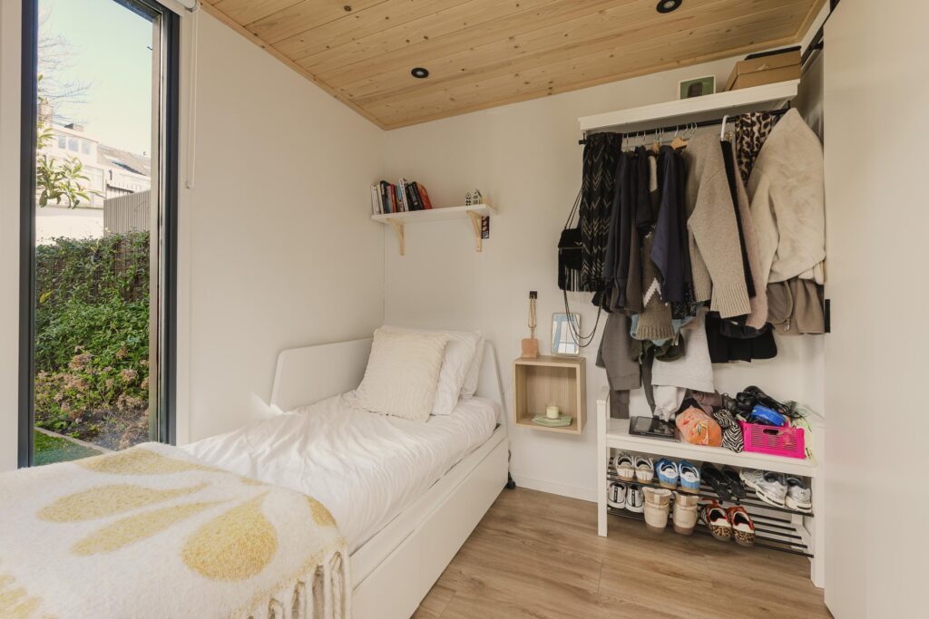 In de achtertuin staat een tuinhuis, die nu dient als opbergruimte.