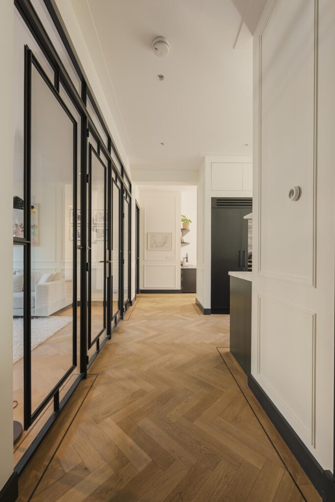 Wat direct opvalt is de breedte van bijna 11 meter. Via de entree betreedt u de hal welke toegang geeft tot alle ruimtes van het appartement. Aan de rechter voorzijde zijn de twee slaapkamers met badkamer, aan de linker achterzijde de primaire slaapkamer met en-suite badkamer en in het midden het woongedeelte.