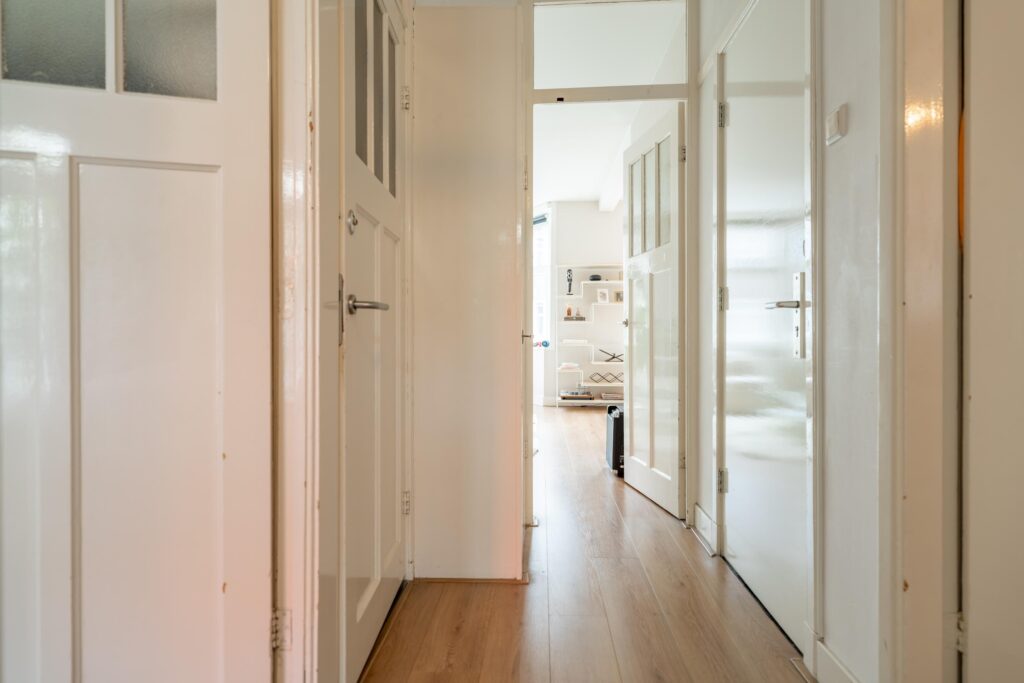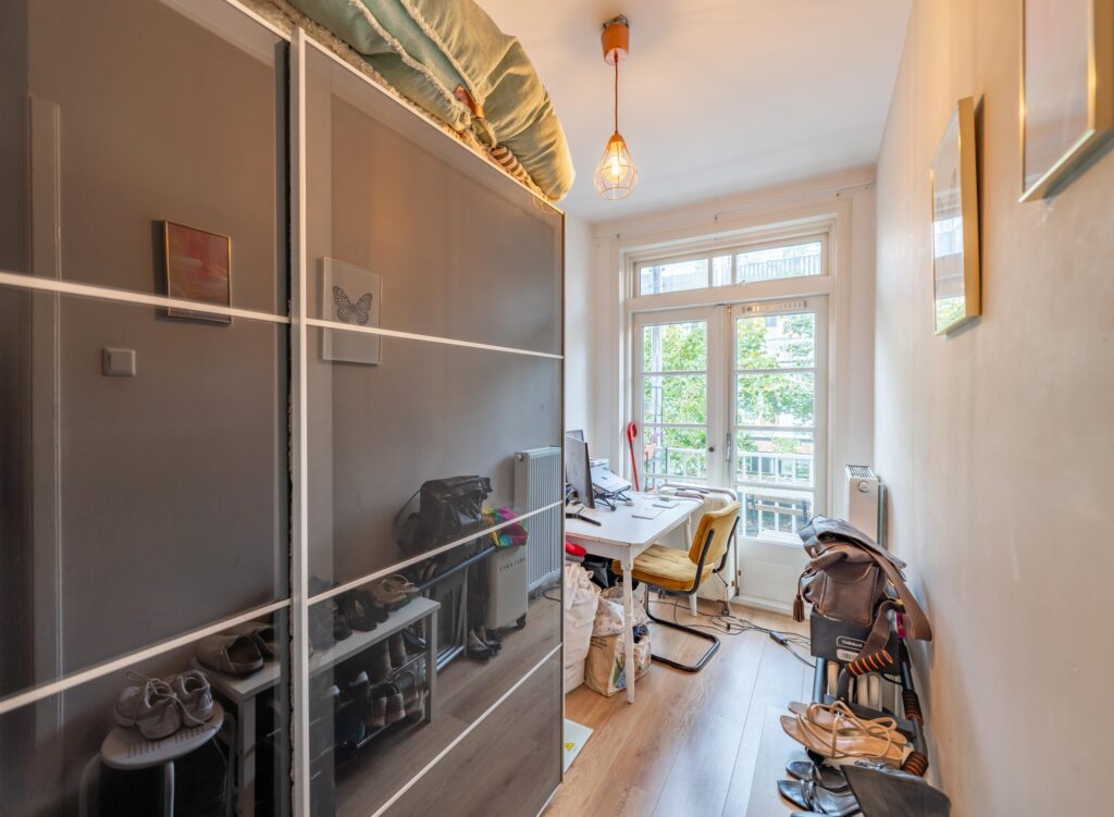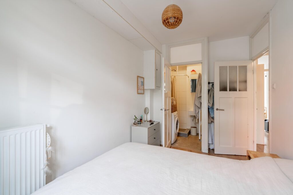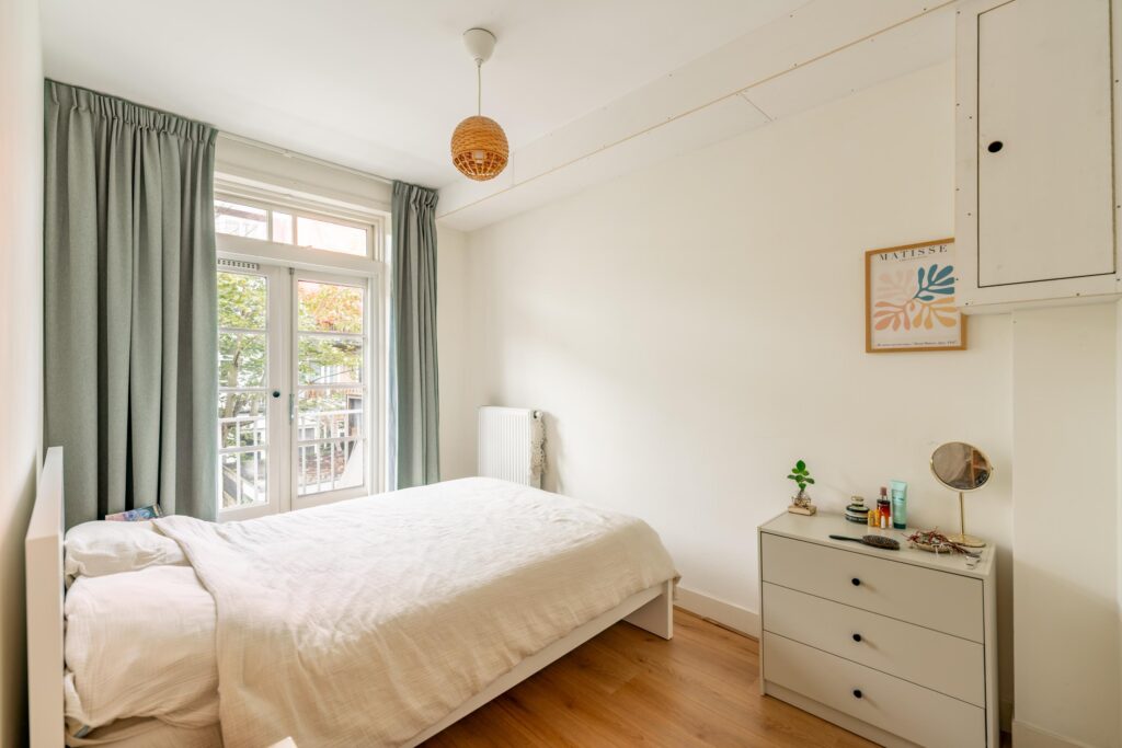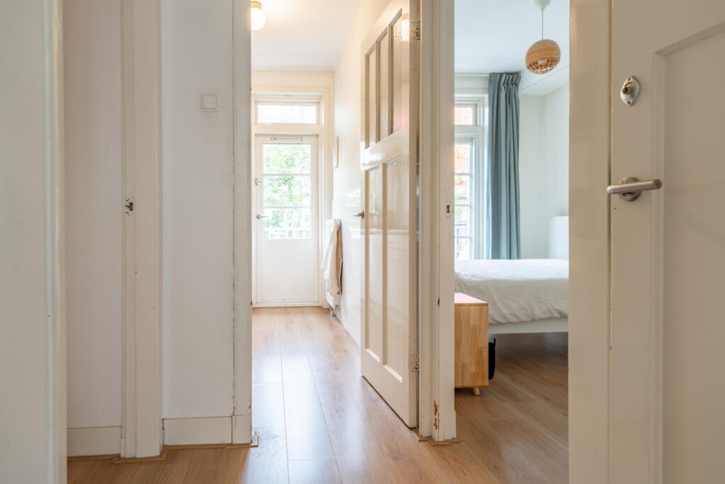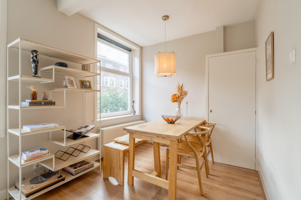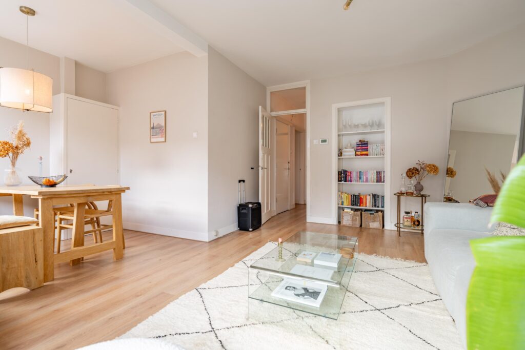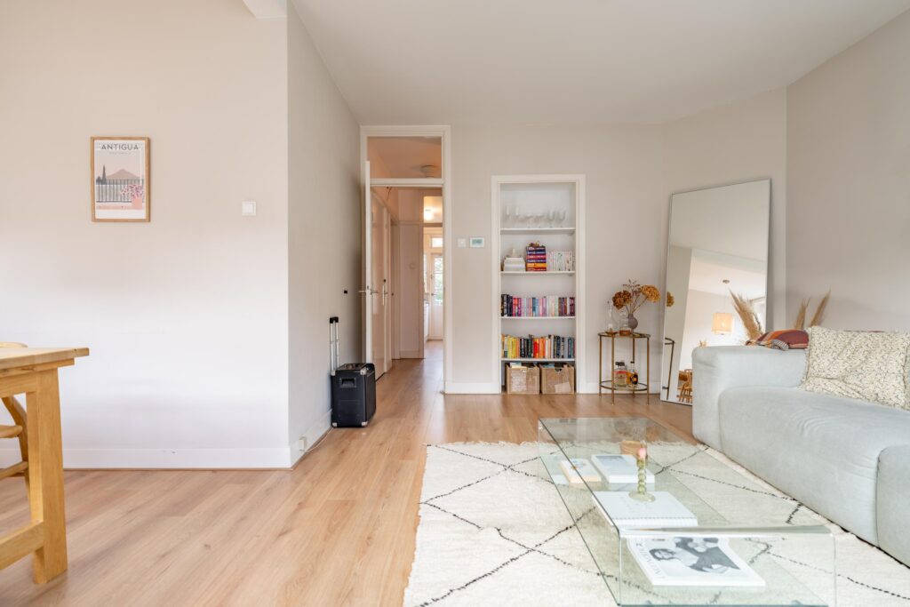 Wanneer je het pand binnenloopt merk je meteen die rustige, vriendelijke Rivierenbuurtsfeer. Je gaat de trap op naar de eerste verdieping, opent de deur… en staat direct in een woonkamer die je omarmt met licht. De erker vangt het daglicht op een manier die je alleen bij deze bouwstijl vindt — warm, zacht, uitnodigend.