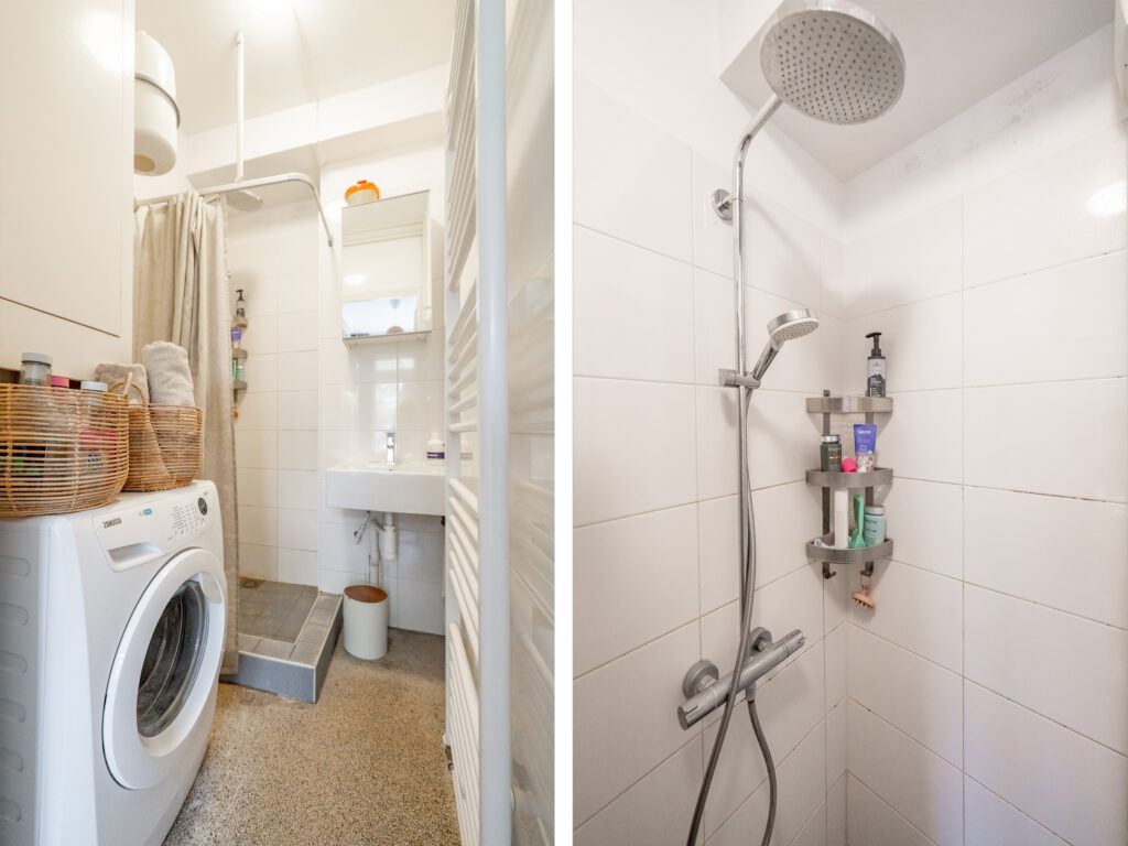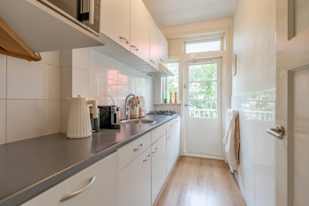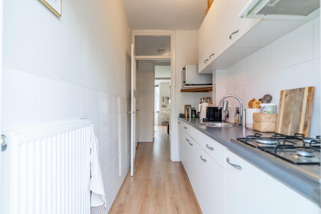 De keuken ligt centraal in het appartement, praktisch ingedeeld en met directe toegang tot het balkon. Precies de juiste plek om ‘s ochtends even naar buiten te stappen met een kop koffie. De badkamer en het separate toilet bevinden zich naast elkaar bij de hal — logisch, overzichtelijk en functioneel.