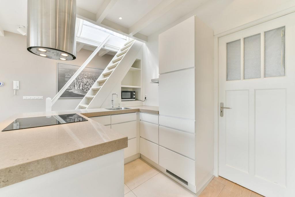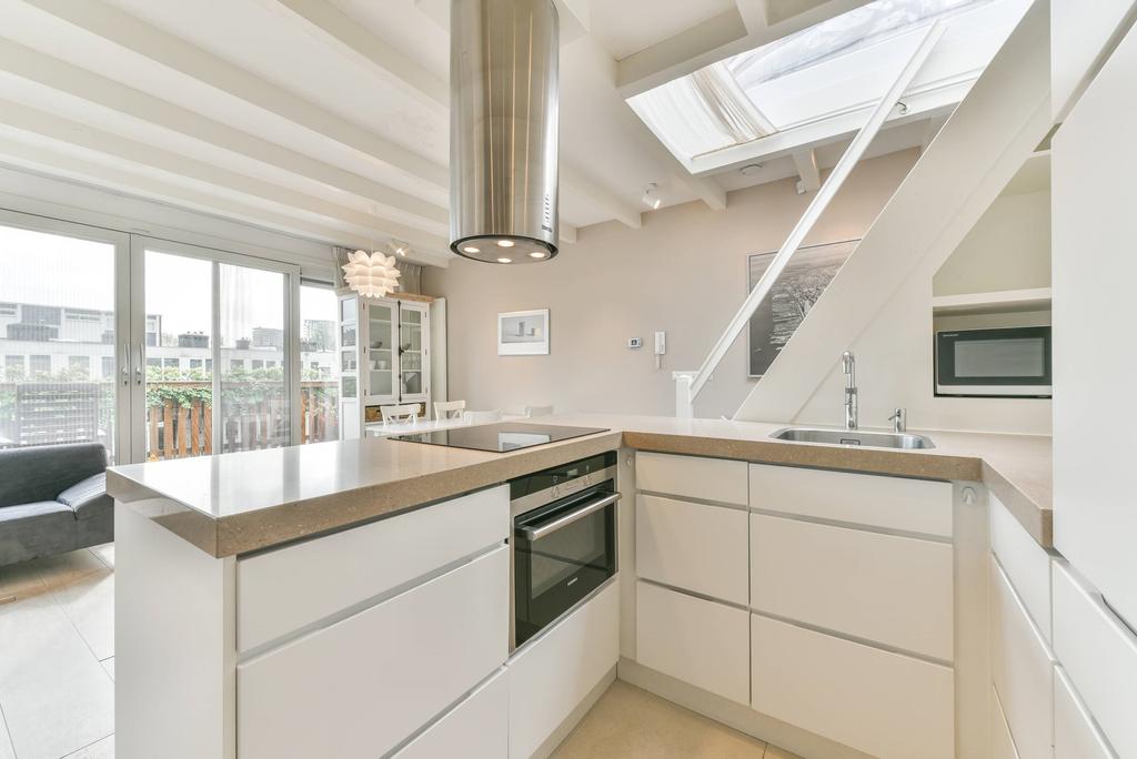 De open keuken is voorzien van inbouwapparatuur zoals: oven, magnetron, ijskast met vriesvak, vaatwasser, 4-pits inductie kookplaat en afzuigkap.
