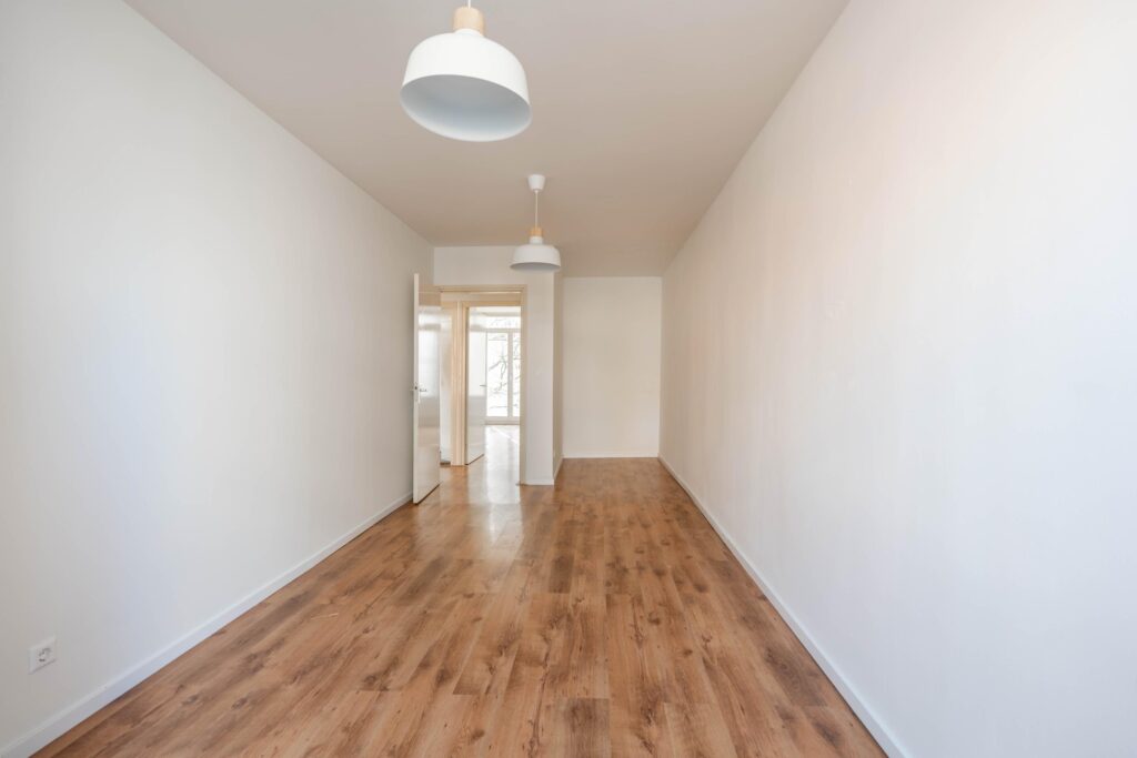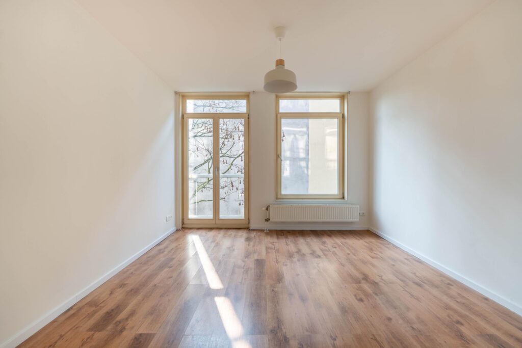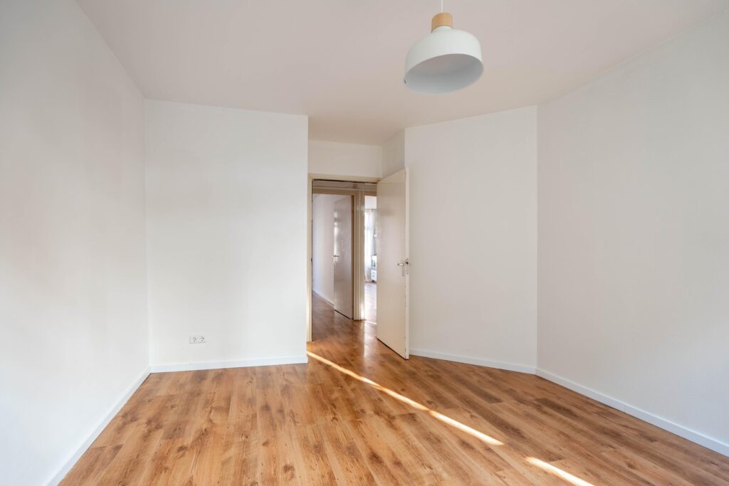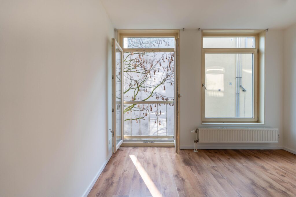 Aan de achterzijde van het appartement ligt de woonkamer met openslaande deuren. Deze ruimte biedt voldoende plek voor een zit- en eethoek.