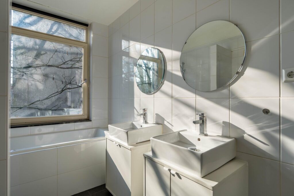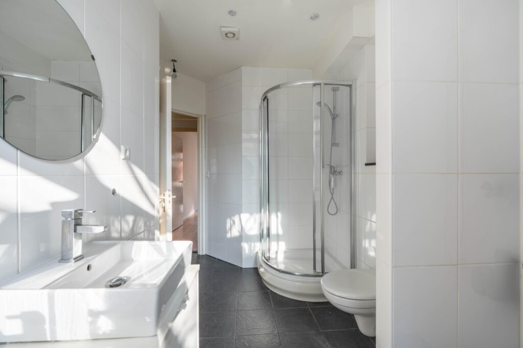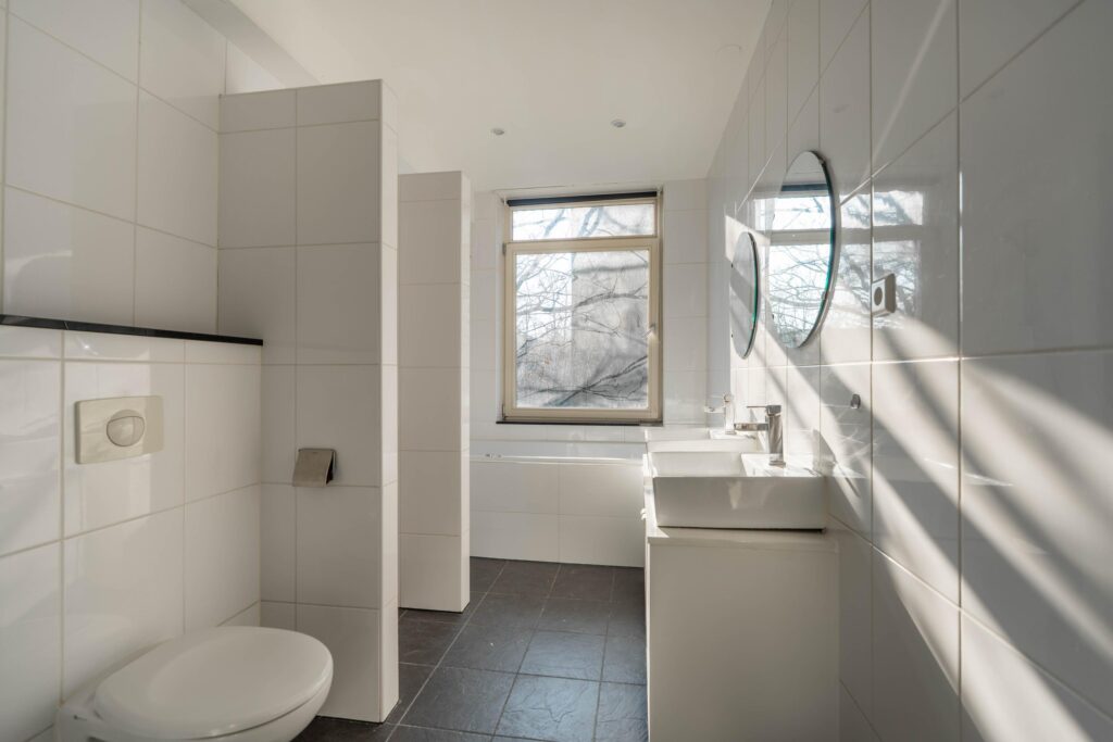 Grenzend aan de woonkamer bevindt zich de ruim opgezette badkamer. Deze is voorzien van een dubbele wastafel, een ligbad, een douche en een toilet.