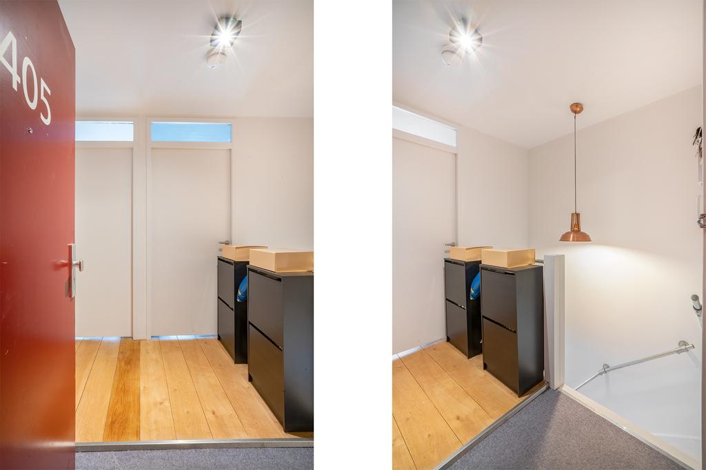 Entree, hal met meterkast en toilet. Op deze verdieping bevindt zich gelijk de badkamer en toegang tot beide slaapkamers. Via beide slaapkamers is een additionele werkruimte bereikbaar middels schuifdeuren.