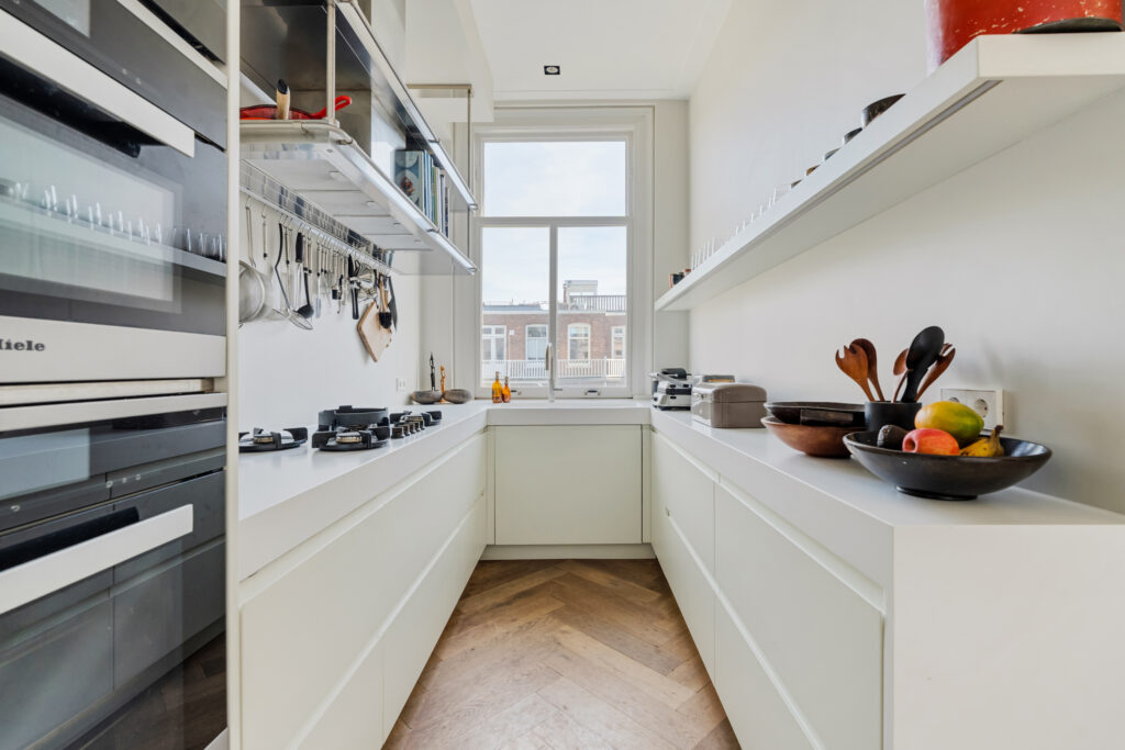 De luxe keuken is voorzien van hoogwaardige inbouwapparatuur, waaronder een vaatwasser, stoomoven, combi-oven en wijnklimaatkast.