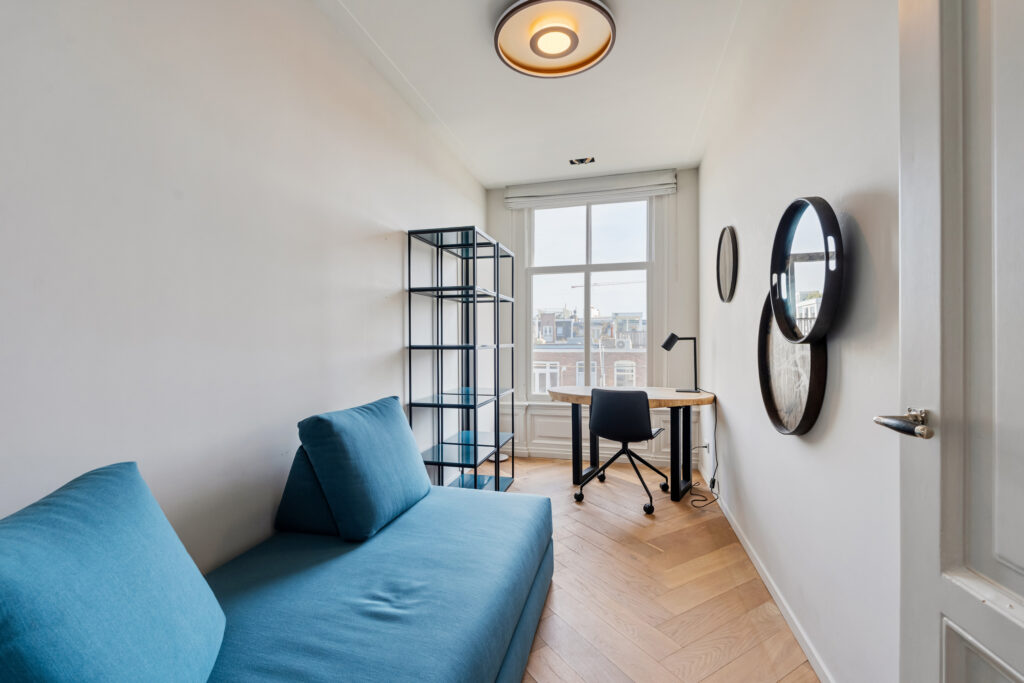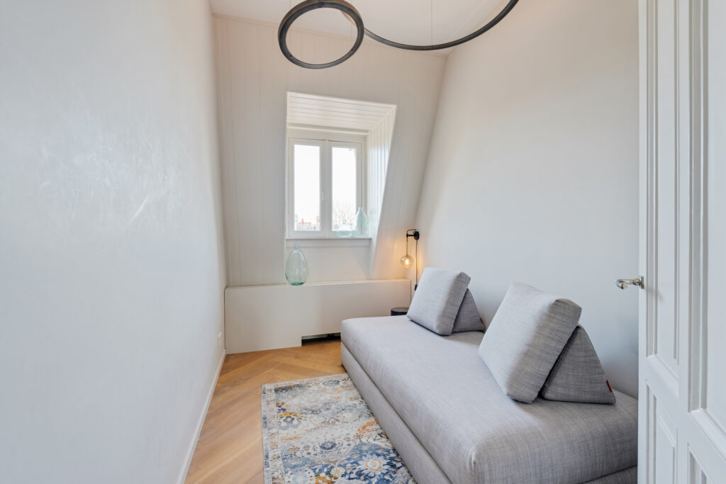 Aansluitend aan de woonkamer bevindt zich een halfopen extra ruimte, die direct toegankelijk is vanuit de woonkamer en tevens via een deur vanuit de hal bereikbaar is. Deze ruimte leent zich uitstekend als stijlvolle werkkamer, library of rustige leesruimte.