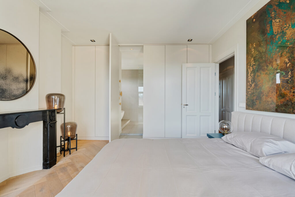 De royale kamer en-suite beschikt aan de voorzijde over een lichte woonkamer met openslaande deuren naar het balkon. De fraaie gashaard en hoge plafonds versterken de warme en stijlvolle uitstraling. De en-suite kasten bieden volop opbergruimte.