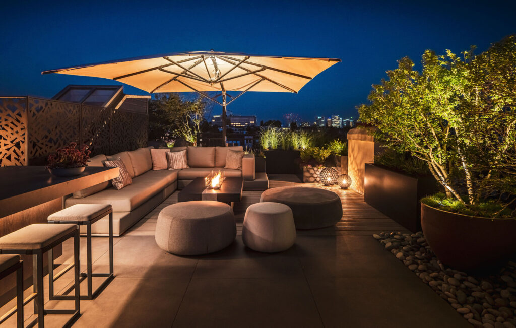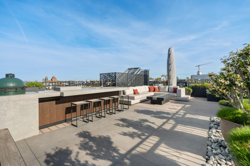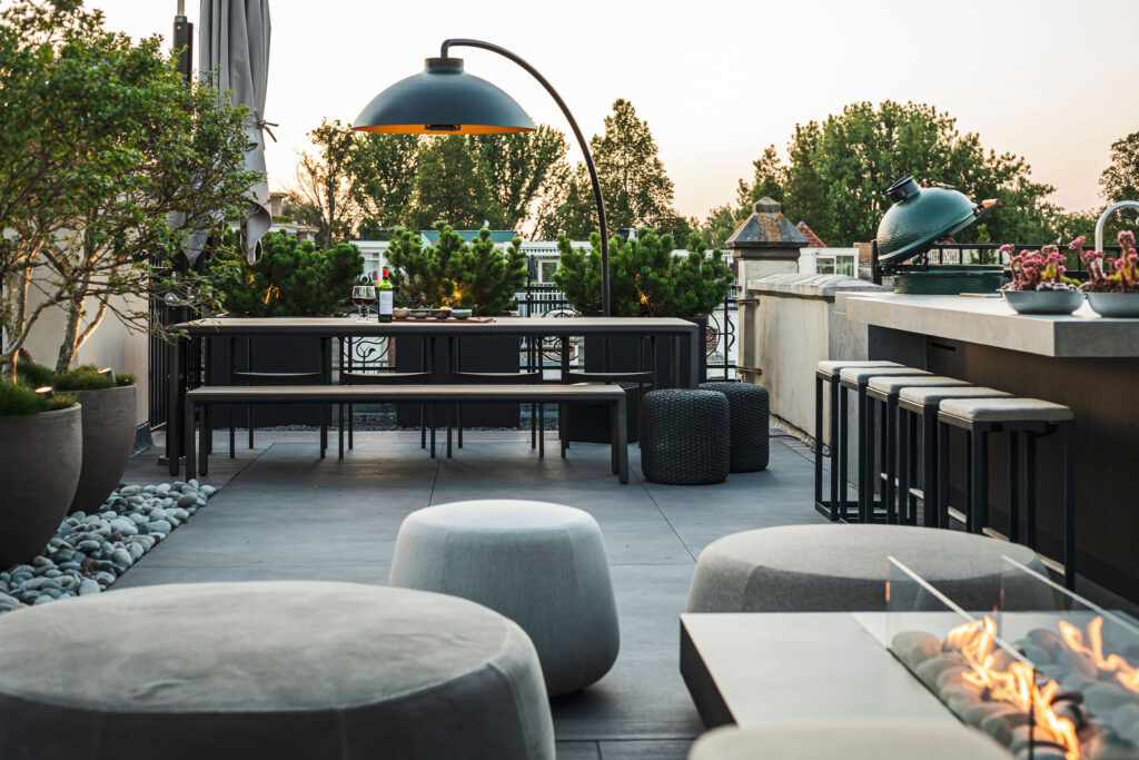 Het terras is verder ingericht met een hoogwaardige design loungebank, waardoor een royaal zitgedeelte ontstaat rondom de op maat gemaakte gasvuurtafel – een ideale setting om te ontspannen, te ontvangen en te genieten van lange zomeravonden.