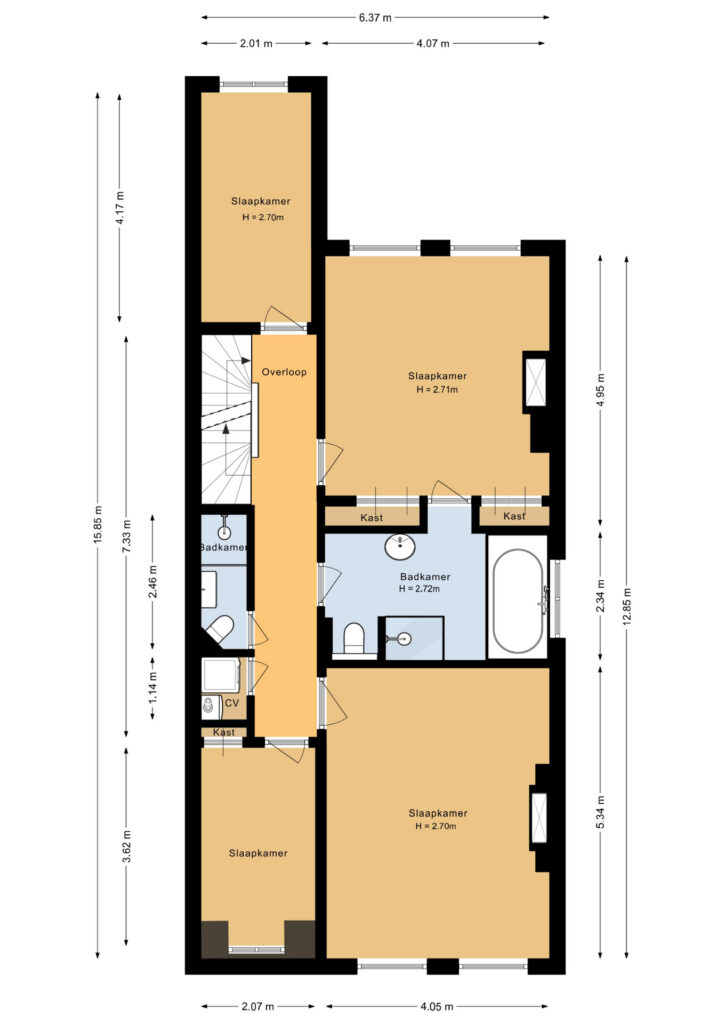Daarnaast zijn er twee kleinere slaapkamers, ideaal als logeerkamer, kinderkamer of extra werkruimte.