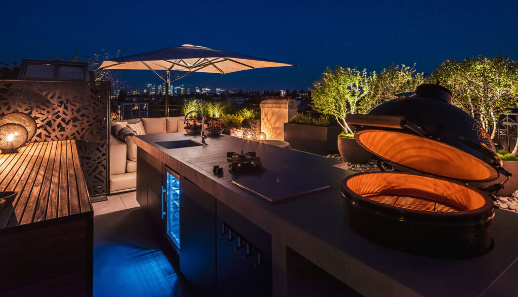 De volledig uitgeruste buitenkeuken (met Big Green Egg, koelkast, geïntegreerde gaspitten (PITT Cooking) en een extra gasbarbecue) beschikt tevens over een bar met zitplaatsen voor vijf personen, ontworpen voor cocktails en drankjes met uitzicht over het dakterras.
