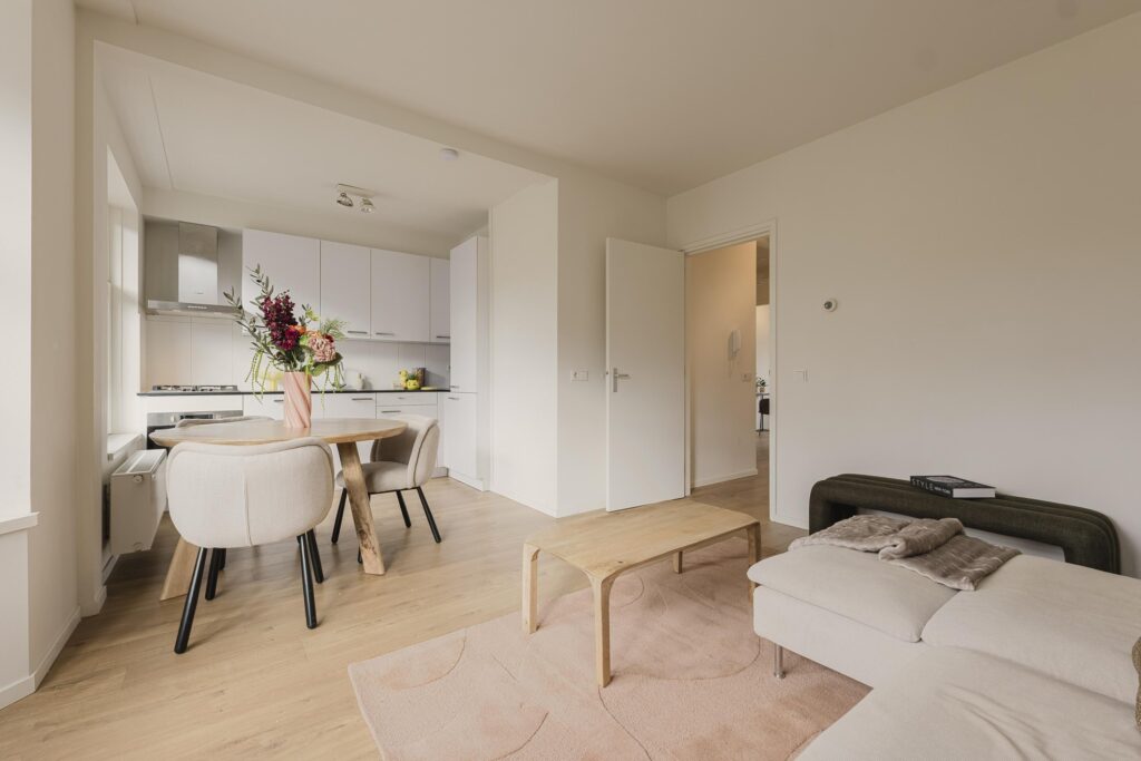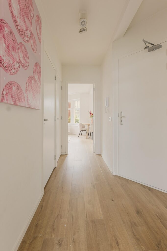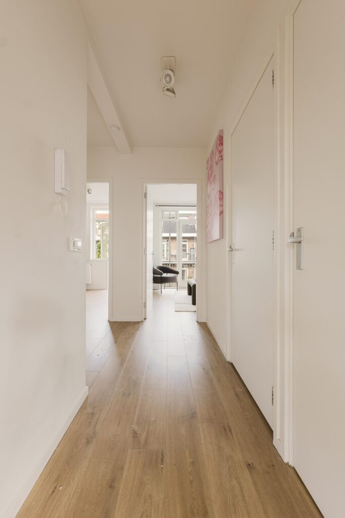 Entrée middels de gemeenschappelijke trapopgang op de tweede verdieping. De entree in de hal welke toegang geeft tot alle vertrekken. Aan de voorzijde de ruime en lichte woonkamer met open keuken. De keuken is van alle gemakken voorzien zoals een vaatwasser, afzuigkap, ijskast, vriezer, oven/magnetron combinatie en 4-pits gasfornuis.