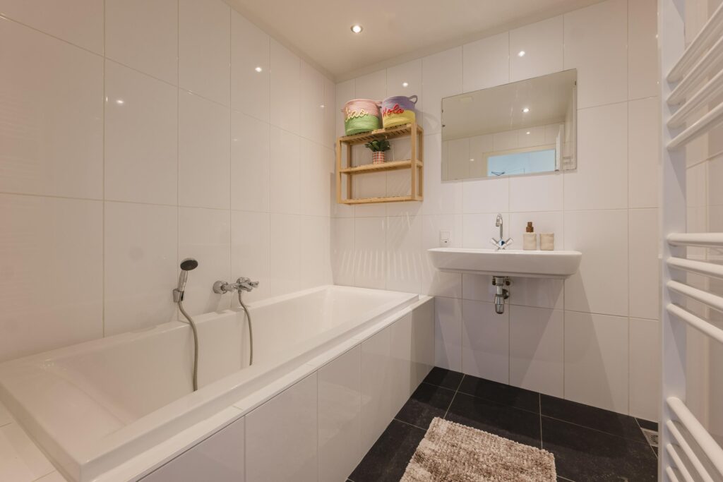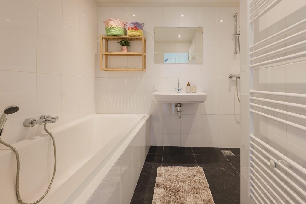 De separate WC, wasruimte en badkamer zijn in het midden van de woning gelegen. De badkamer beschikt over een ligbad, wastafel en inloopdouche.