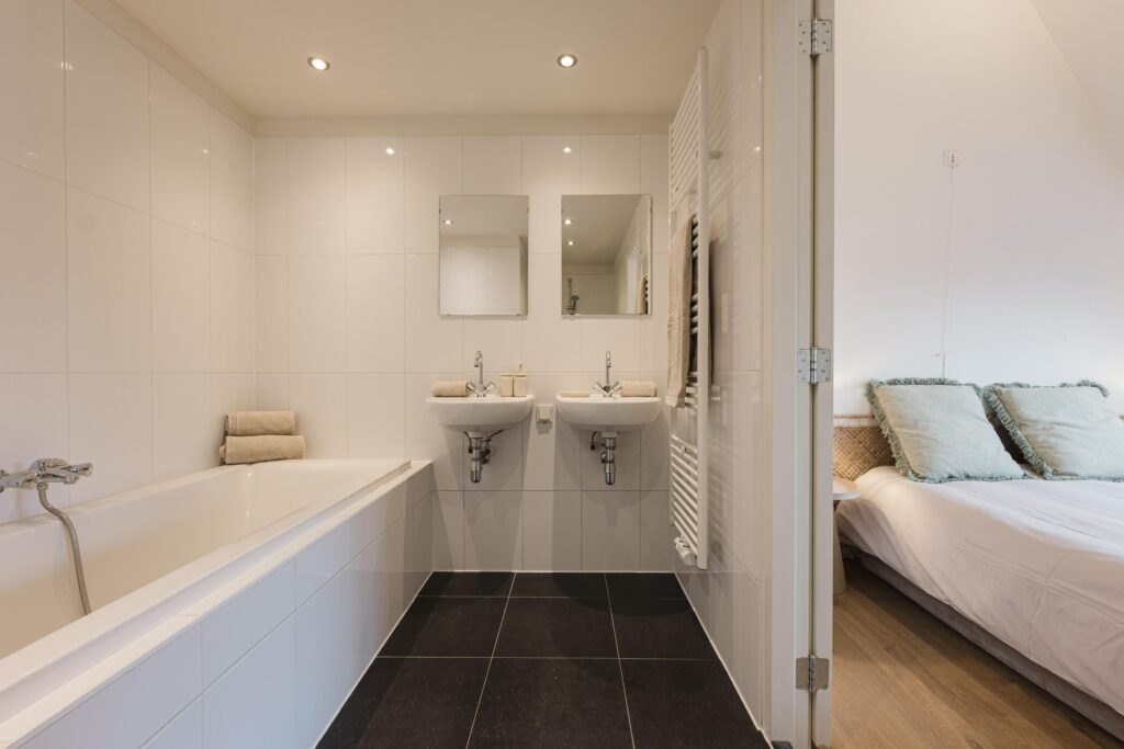 De badkamer die toegankelijk is via de master beschikt over een ligbad, dubbele wastafel en inloopdouche.