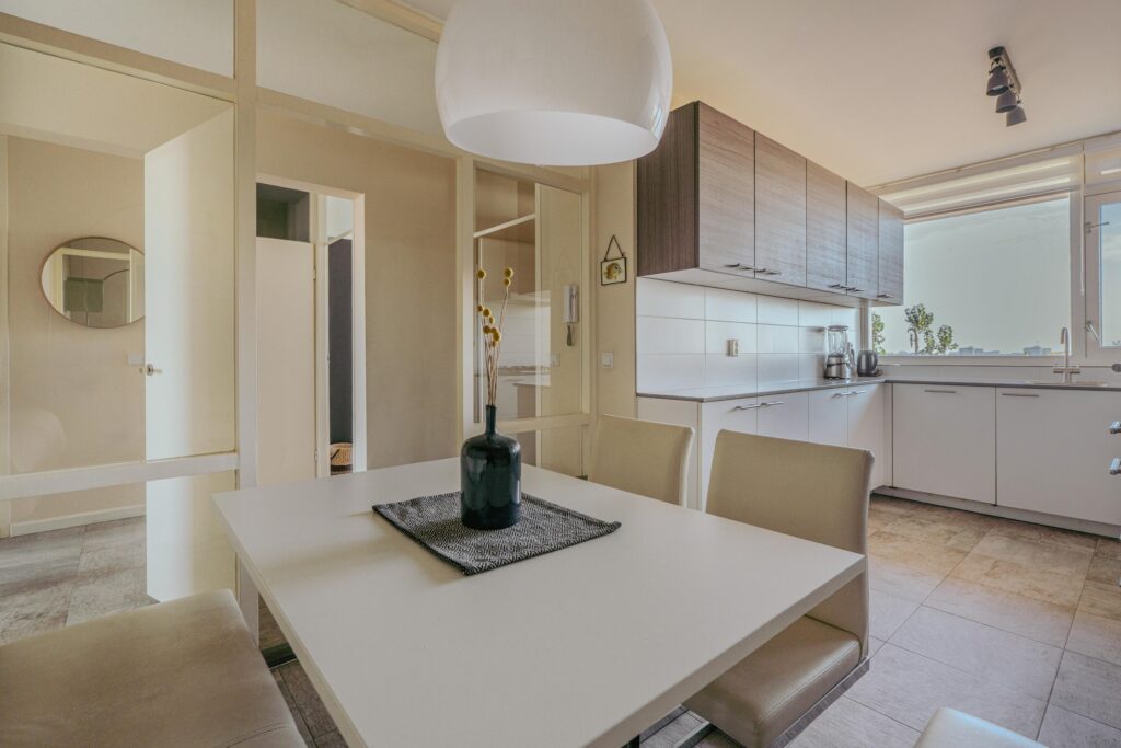 + Je kunt de muur tussen de keuken en woonkamer verwijderen. Hiervoor is géén vergunning nodig, maar moet wel worden gemeld bij de huismeester.