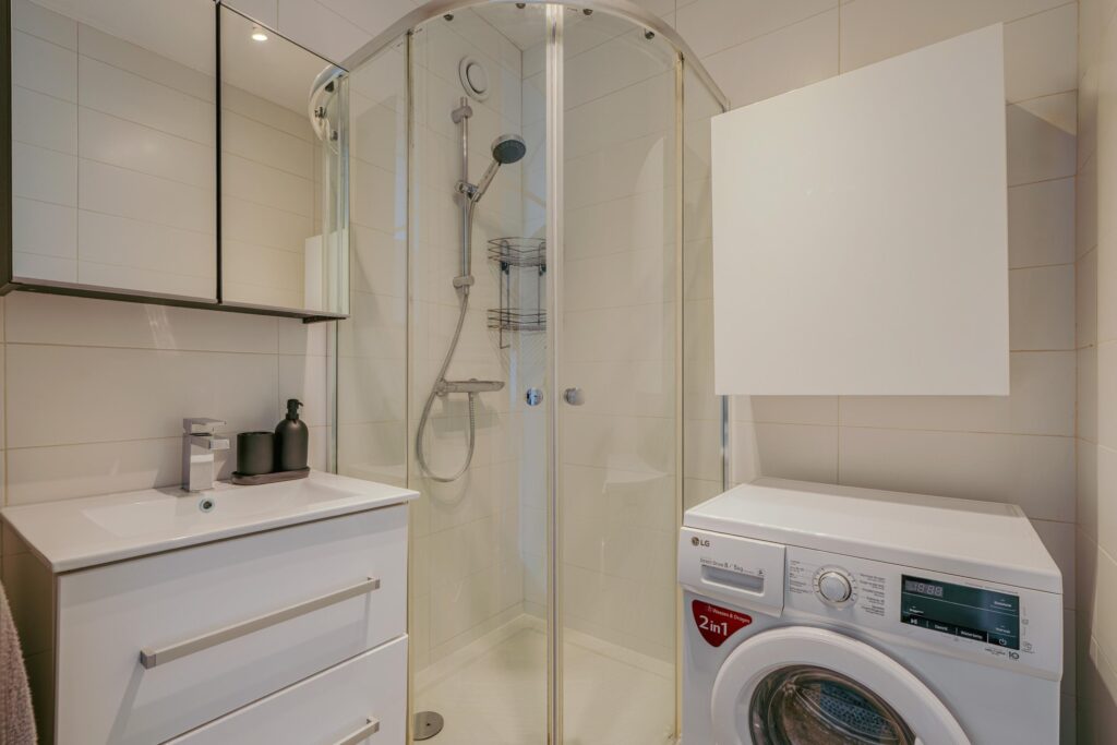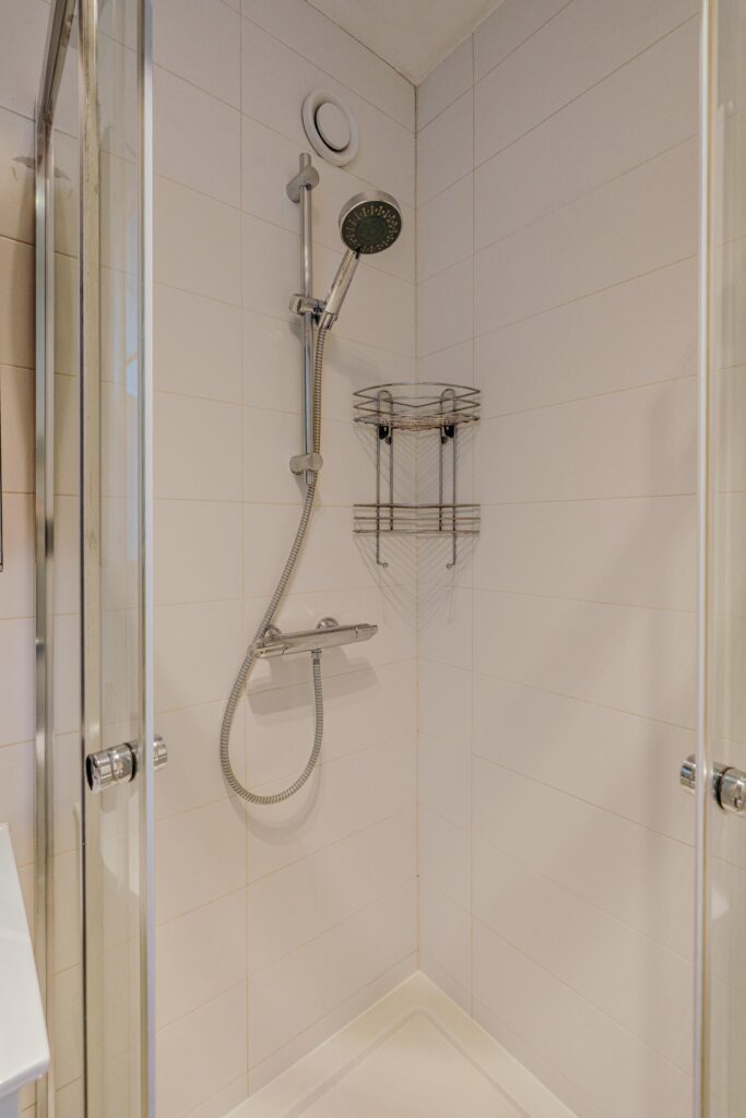 De volledig betegelde badkamer is uitgerust met douchecabine, wastafelmeubel, designradiator en wasmachineaansluiting. Separaat toilet met fonteintje, eveneens volledig betegeld.